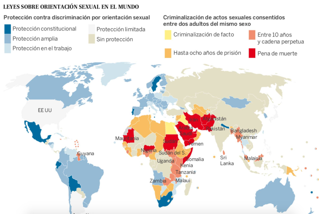 Hay un mapa del mundo que se divide básicamente en dos colores. Uno impregna 70 países, donde ser gay o lesbiana es ilegal, incluso letal. Otro tiñe las 123 naciones donde mantener relaciones sexuales con personas del mismo sexo no está castigado. La mayor asociación de defensa del colectivo LGTBI del mundo dibuja este croquis periódicamente que muestra cómo decrecen los lugares donde se persigue a las personas por su orientación sexual y emergen nuevas amenazas, como la llegada al poder de líderes homófobos.